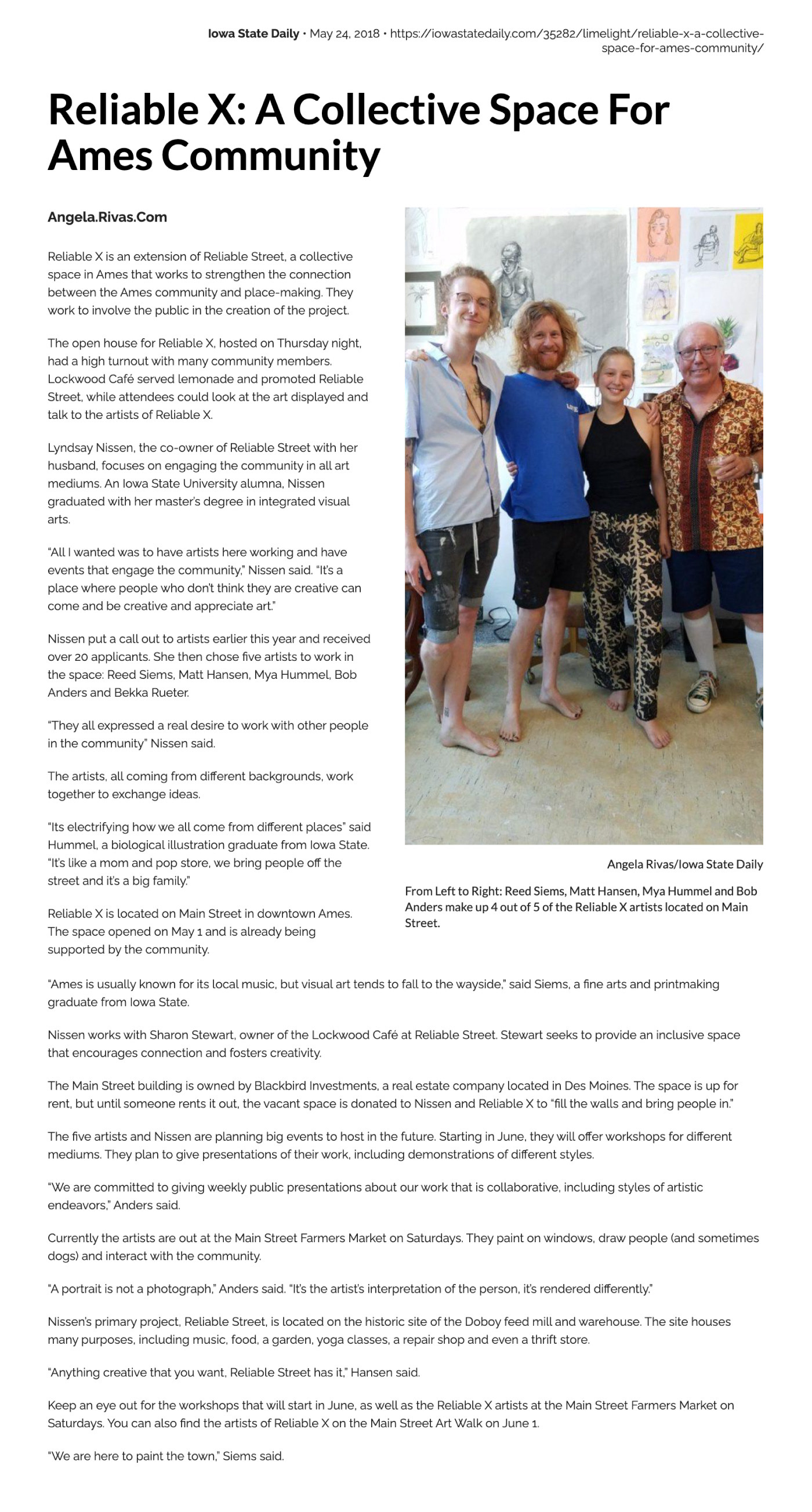 An artist-in-residence experience focused on connecting the community with art. Proudly taught workshops, organized a DIY concert during Ragbrai featuring local artists and led Saturday portrait studios.